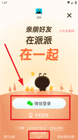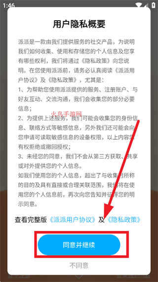 下载安装并打开派派app,在用户隐私概要提示界面点击同意并继续