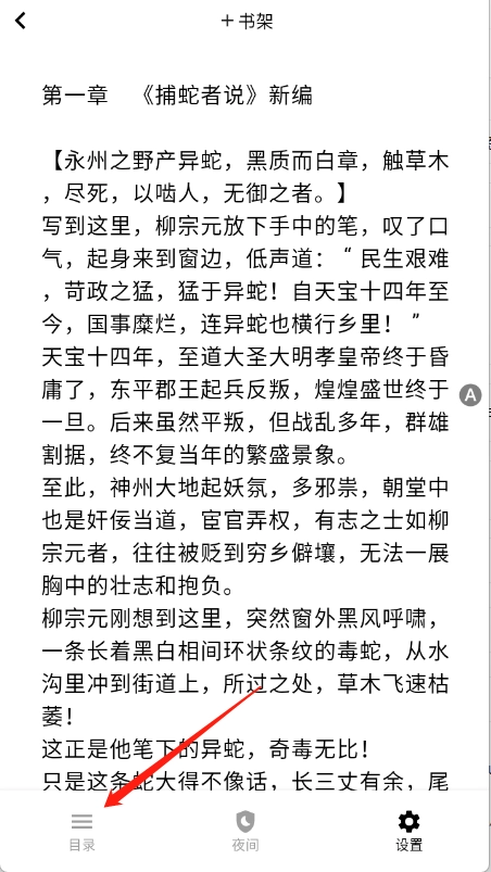 点击进入小说正文阅读页面后,轻点屏幕的任意一处,接着点击“目录”按钮。