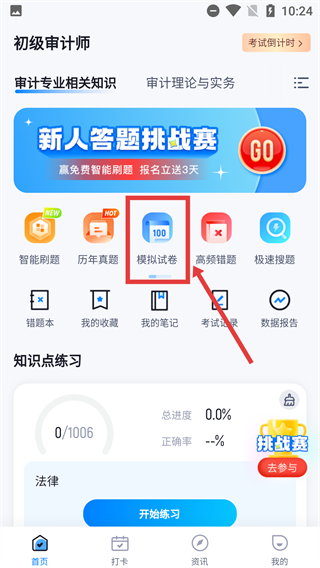 1、在【初级审计师】首页,点击【模拟试卷】功能入口,进入模拟试卷的选择页面,即可进行试卷练习。
