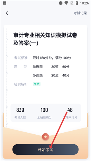 3、进入【审计专业相关知识模拟试卷及答案(一)】的详情页面后,先对考试标准进行确认,接着点击页面底部的【开始考试】按钮,即可进入答题环节。