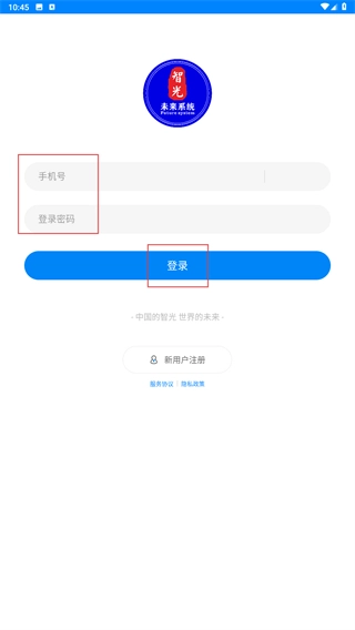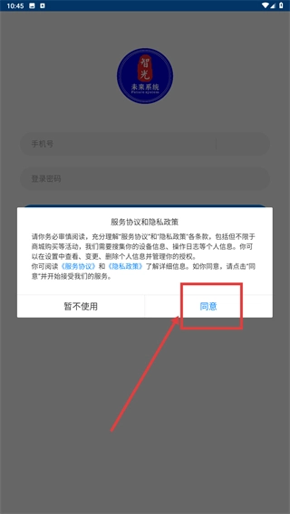 1、在【智光-未来系统】的服务协议,点击【同意】按钮,确认《服务协议》与《隐私政策》,进入应用登录流程。