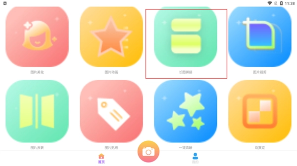 1、在首页功能区点击【长图拼接】,进入长图拼接功能页,可将多张图片拼接成长图。