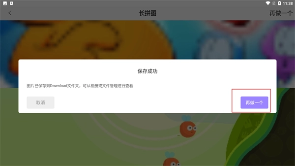3、保存成功后,若需继续拼接长图,点击弹窗内的【再做一个】,返回长图拼接功能页。