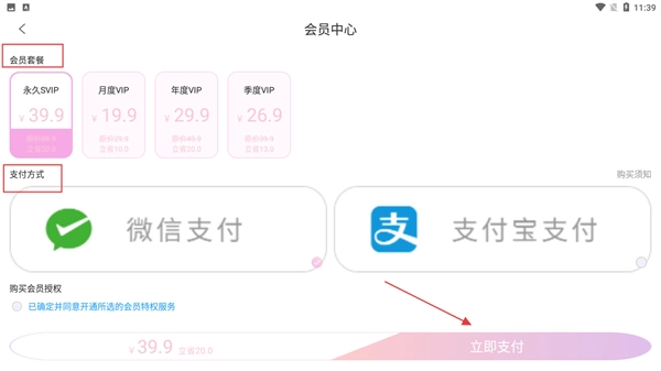 4、进入会员中心,选择【会员套餐】(如永久SVIP),选定【支付方式】后勾选协议,点击【立即支付】开通会员。