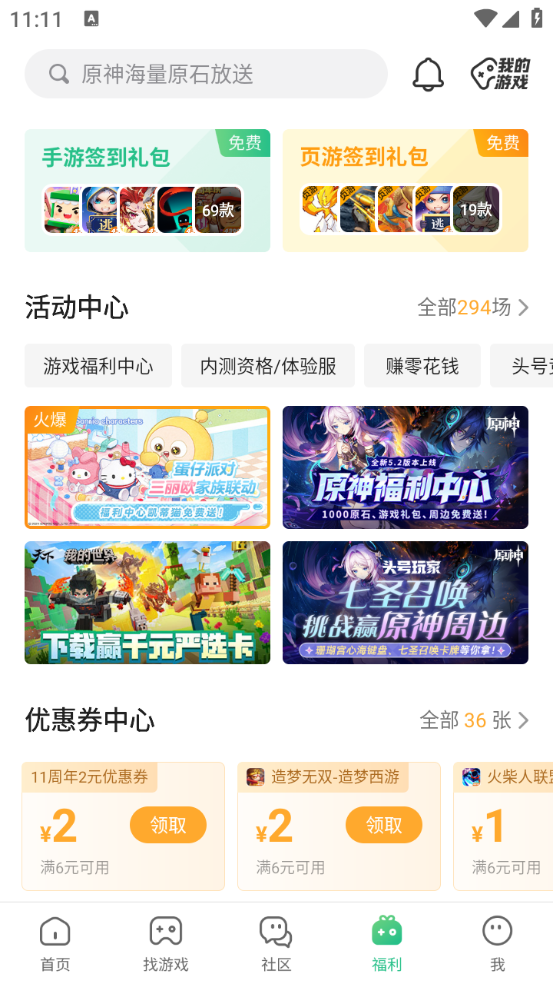 6、点击“福利”选项,会看到专区和电脑专区两个分类,这里提供的都是与游戏相关的福利内容。