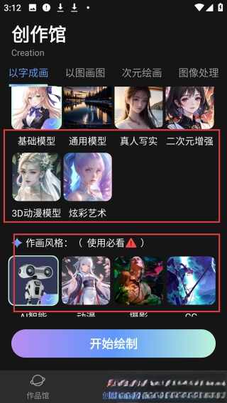 若想获取更高质量的作品,您可以进入【高级模式】,在其中设置画风并选用模型智能绘画专业版。
