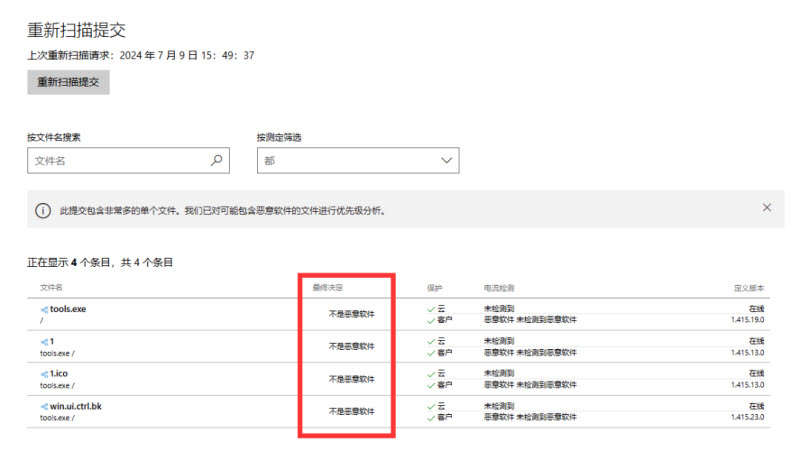 我们开发的PC端抽卡分析工具,由于是出于兴趣无偿制作的,没有为其购买【数字代码签名证书】——这类证书的年费大约6000元,已经超出了我们的支付能力,因此软件会被杀毒软件【误报拦截】。不过我们已将该软件提交给微软进行检测,以证实它并非恶意程序。以下是微软出具的人工检测报告。