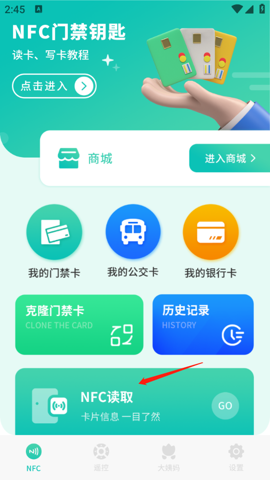 2、在首页的“NFC”功能中点击“nfc读取功能”。