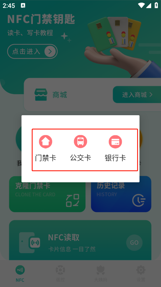 智能NFC工具,可以帮助你复制各种nfc卡,包括门禁卡、公交卡以及银行卡,还支持手机秒变遥控器,可以控制家电,包括空调、投影仪以及电视等等,很方便,这些功能都是免费的,轻松克隆nfc卡和遥控器功能给生活带来了更多的便利。