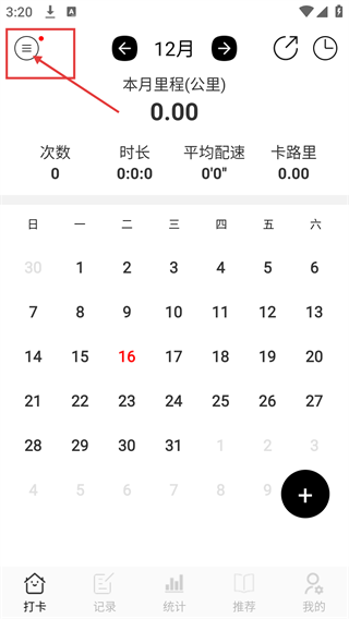 1、在打卡页面点击左上角的菜单按钮,就能查看12月的跑步相关数据,像【本月里程(公里)】、【次数】等,目前这些数据都显示为0。