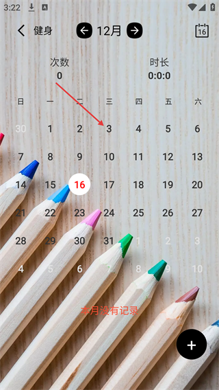 3、选择【健身】项目后进入对应的日历页面,页面会显示【本月没有记录】,此时可选择具体日期,为记录该日期的健身运动数据做准备。