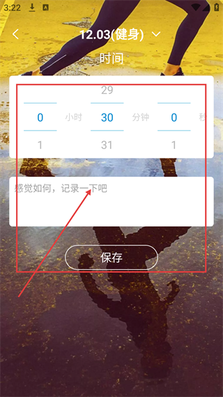 进入健身记录页面后,能够对【小时-分钟-秒】的运动时长进行调整,填写【感觉如何,记录一下吧】的相关内容,完成这些操作后点击【保存】按钮即可。
