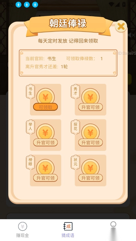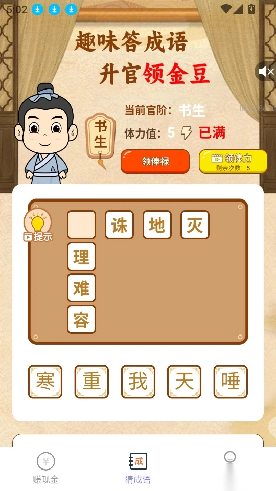 在软件的赚现金界面下方的菜单栏里,点击“猜成语”按钮就能进入下一步操作。