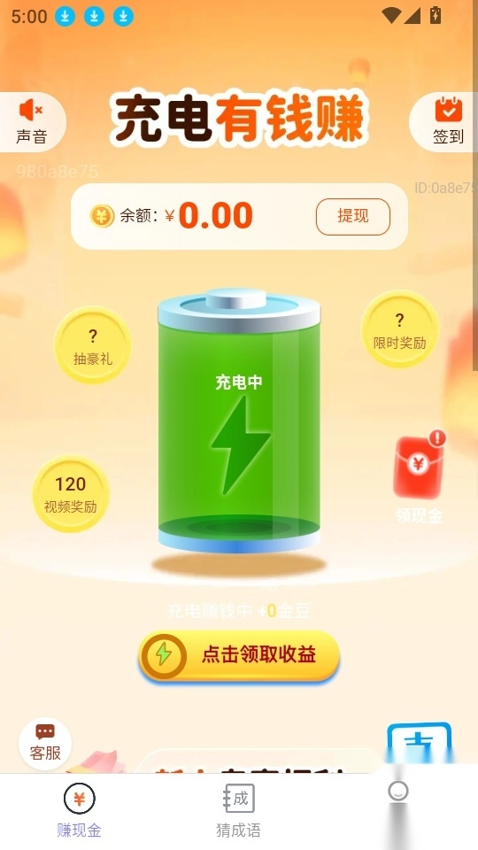 充电聚宝盆支持用户实时充电赚钱,助力智慧充电,通过手机充电领取更多金豆奖励来赚零花钱,还能实现充电答题赚钱;应用内设有猜成语版块,趣味猜成语可实时获取更多金豆,兑换成现金后极速提现到账。