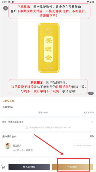 4、在商品详情页,确认【下单提示】【购买提示】后,点击【立即购买】按钮,进入下单流程。