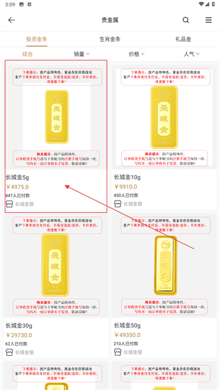 3、在投资金条列表,选择目标商品(如【长城金5g】),点击进入该商品的详情页面。