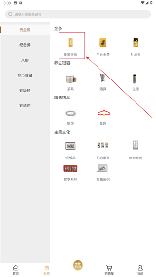 2、在分类页选择【贵金属】类目,点击【投资金条】选项,进入对应商品列表页。