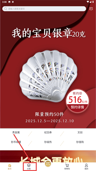 1、在首页点击【分类】按钮,进入商品分类页面,可查看【贵金属】【纪念券】等品类的商品。