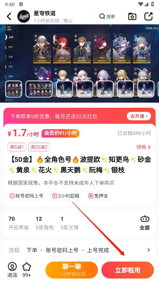 4、挑选好想要的游戏账号后,点击“立即租用”按钮就行。