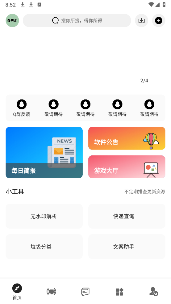 2、打开软件后,首页陈列着不少实用小工具,像无水印解析、快递查询、文案助手之类的功能都包含在内。
