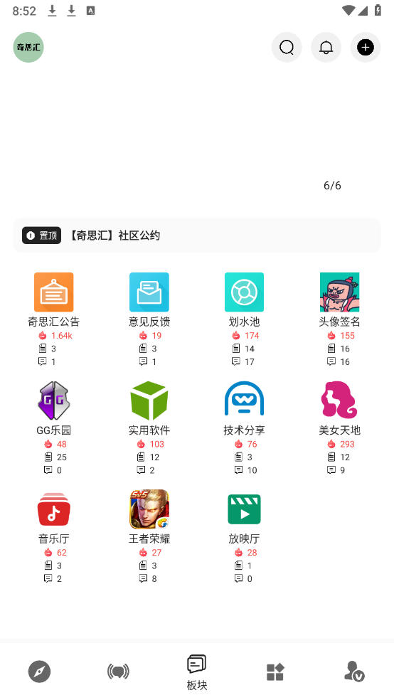 4、点击“板块”,这里包含游戏、音乐以及技术分享等内容。