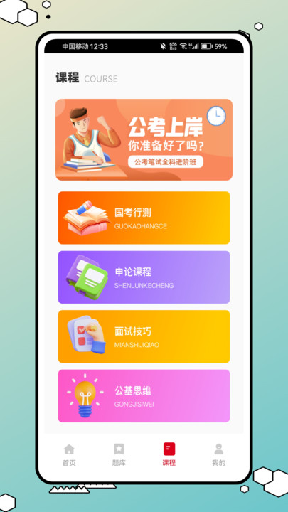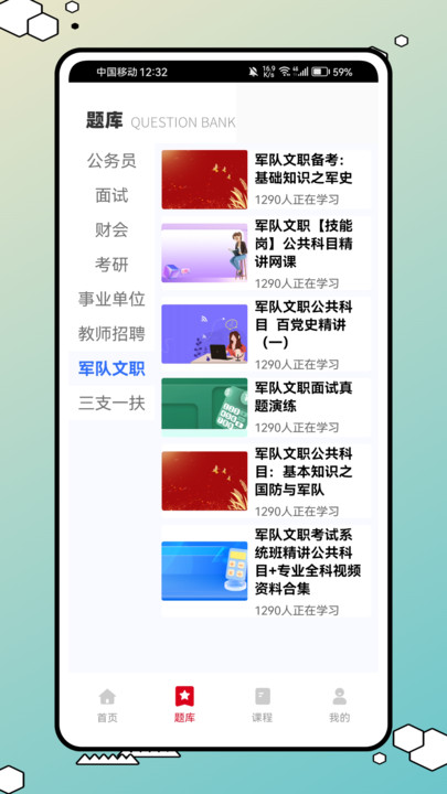 题库页面同样精彩丰富,涵盖了公务员面试、考研学习课、军队文职、三支一扶等各类课程。