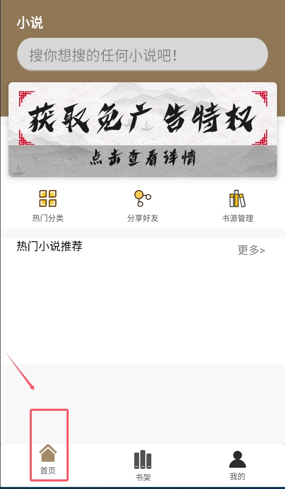 首页是各类功能的集中区域,用搜索框找书最快捷,通过热门分类可以探索新书,借助书源管理能切换不同来源,分享按钮则用于传播好书,这几个核心功能需要熟练掌握。