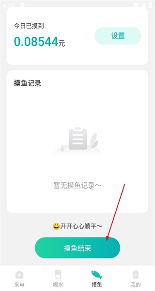 摸鱼一会儿后,界面会显示今天已经摸到的金额,点击摸鱼结束按钮就能完成这次摸鱼记录。