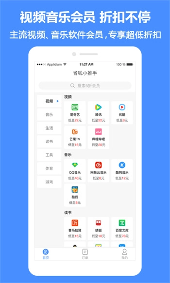 省钱小推手是一款为用户量身打造的生活服务类软件,它构建了更可靠的省钱购物体系,用户在平台上能获取丰富的优惠折扣,涵盖各类影视会员等多样福利,可享受一站式购齐的便捷服务体验。尤其在购买视频会员时,能享受到大幅优惠,所有商品价格均低于常规售价,切实保障用户享受到最贴心的优惠福利。