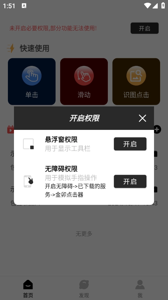 进入应用后,首先需要开启悬浮窗权限与无障碍权限,不然部分功能将无法正常使用。