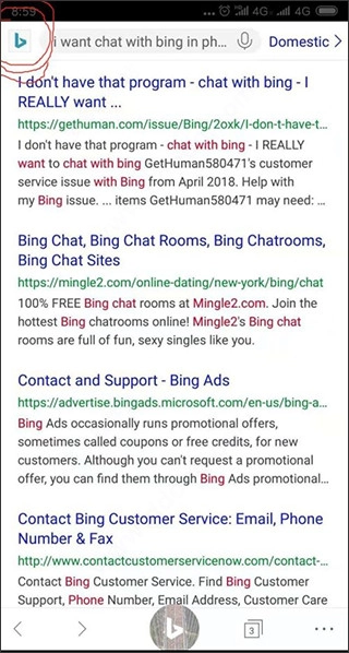 2.在输入框中输入“ I want chat with bing in phone", 手机上输入其他的文字不会调出 AI对话机器人,只有简单的搜索功能。