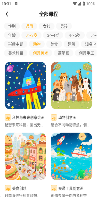 丰富的课程体系:包含绘画基础、色彩认知、创意手工等多个领域,课程内容丰富多元