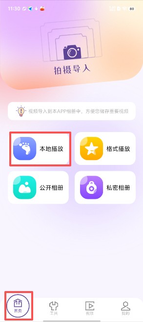 第一步:打开软件进入首页,找到页面上的“本地播放”