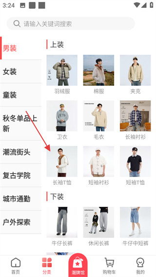2、在商品分类页面,挑选自己心仪的分类,比如潮流街头类目下的长袖T恤,这样就能进入长袖T恤商品列表页面。
