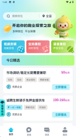 1、在首页中提供视频剪辑、宝妈剪辑、语音兼职,同时还有今日精选的岗位;