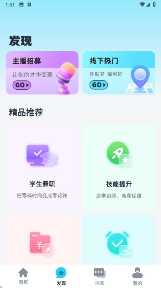 3、在发现页面中有主播招募、线下热门、学生兼职、技能提升、日结专区、副业兼职和每日精选版块;