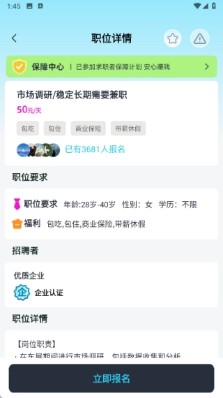 2、在职位详情页面中可以了解各类岗位的信息,让你随时立即报名;