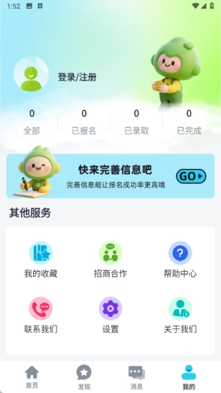 4、在我的页面中有已报名、已录取、我的收藏、招商合作等不同内容。