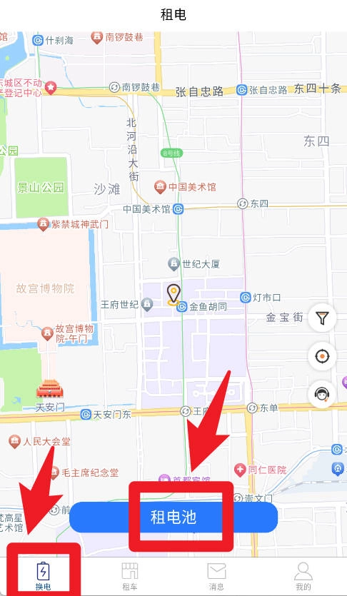 在租电界面,用户能借助地图查看周边站点,点击租电池按钮后,就能便捷地找到并租赁所需电池。