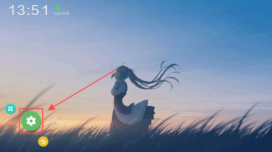 电视安装好桌面软件后,用遥控器按左右键,在左下角找到设置按钮。