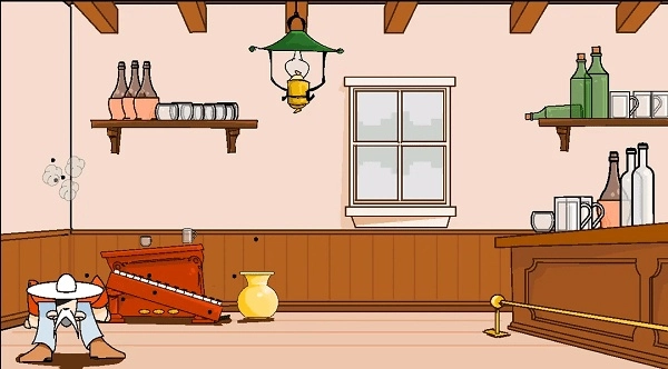 玩家能够借助场景里的各类道具来通关——比如打掉怪老头身后的桌子,或是他上方、右侧的玻璃杯,通过这些方式把他引诱到右边,再让掉落的筒子将他罩住即可。