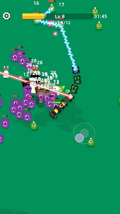消灭怪物可获得经验,提升等级后能选择新车辆或升级效果。每一波都会有不同怪物出现,消灭关卡里所有波次的怪物即可通关。