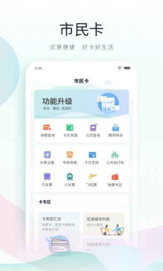 账号注册、密码修改、登录账号更换、市民卡绑定、网点信息、卡片功能介绍、客服信息、微信公众号信息等。