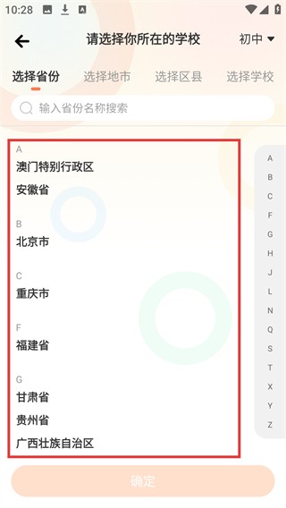 4、进入【请选择你所在的学校】界面,先选【省份】,再依次选地市、区县、学校,也可搜索省份名称快速查找。