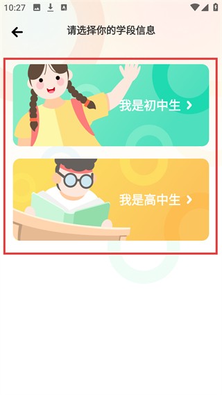 3、进入学段选择界面,可依据自身情况点击【我是初中生】或【我是高中生】选项,完成学段信息的选择。