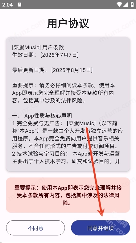 1、打开菜蛋Music软件点击同意并继续