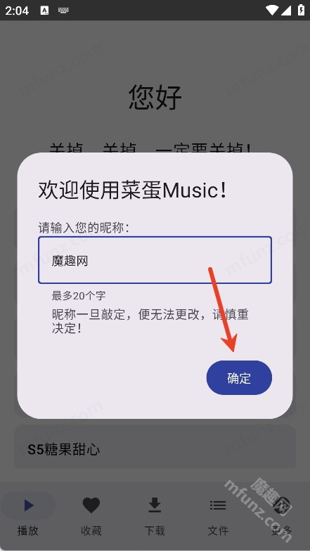 2、填写昵称后点击确定按钮(请注意:昵称一旦确定便无法修改,请务必慎重选择!)