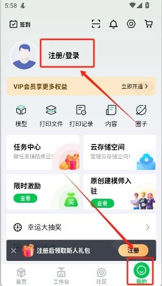 2、进入首页点击“我的”,然后点击“注册/登录”登录账号