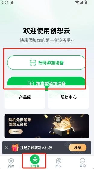 3、点击“工作台”,选择“扫码添加设备”或者“按照类型添加设备”,按照提示完成设备的添加。