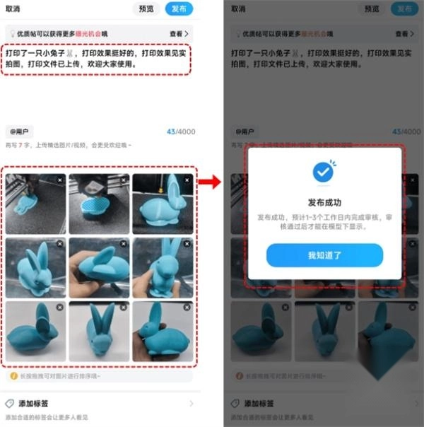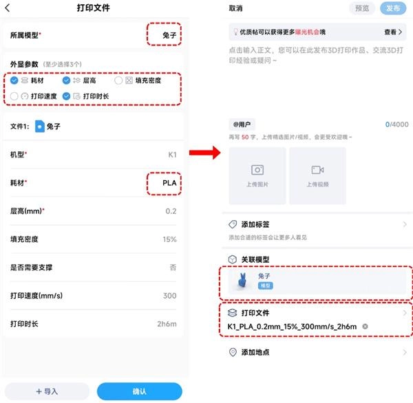 2.2 在【打印文件】页面,确认打印文件所属模型、勾选外显参数、编辑耗材等参数,无误后点击“确认”按钮,进入【发帖】页面,如下图所示: